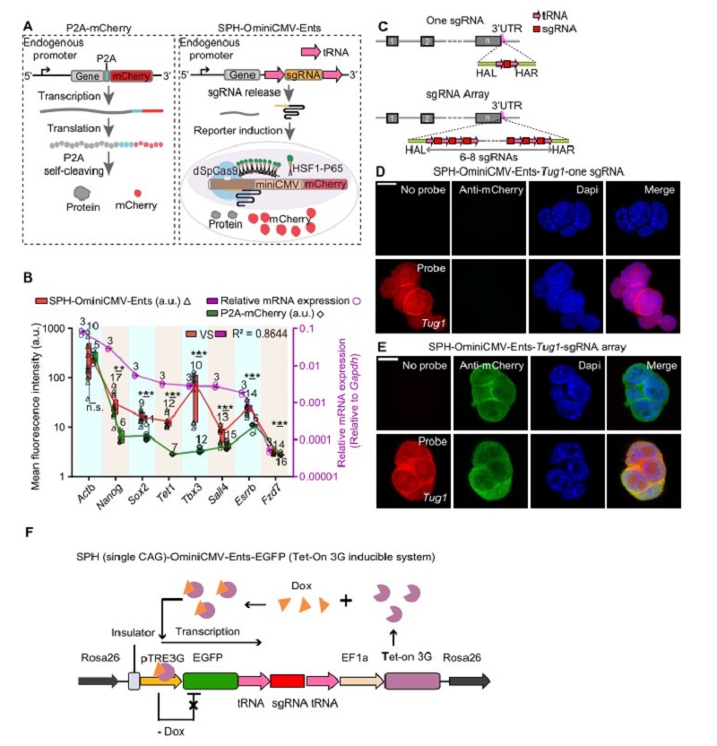 圖注1:(A)示意圖顯示P2A-mcherrySPH-OminiCMV-Ents兩種標(biāo)記基因的策略。(B)在mESC細(xì)胞中用SPH-OminiCMV-Ents策略(紅色三角形)和P2A- mCherry策略(綠色菱形)標(biāo)記不同的基因,統(tǒng)計(jì)其mCherry熒光信號(hào)強(qiáng)度以及用qPCR分析這些基因的表達(dá)水平(紫色圓圈,紫色y軸)。(C)示意圖顯示插入一個(gè)sgRNA或一個(gè)sgRNA陣列的標(biāo)記策略。(DEFish圖像顯示對(duì)lncRNA Tug13'UTR中插入一個(gè)sgRNA或一個(gè)sgRNA陣列后,細(xì)胞系中mCherry報(bào)告熒光信號(hào)的表達(dá)情況。(F)可控的Tet-on系統(tǒng)示意圖,Dox誘導(dǎo)EGFP-sgRNA前體轉(zhuǎn)錄,成熟的sgRNA釋放出來(lái)激活mcherry報(bào)告系統(tǒng)。