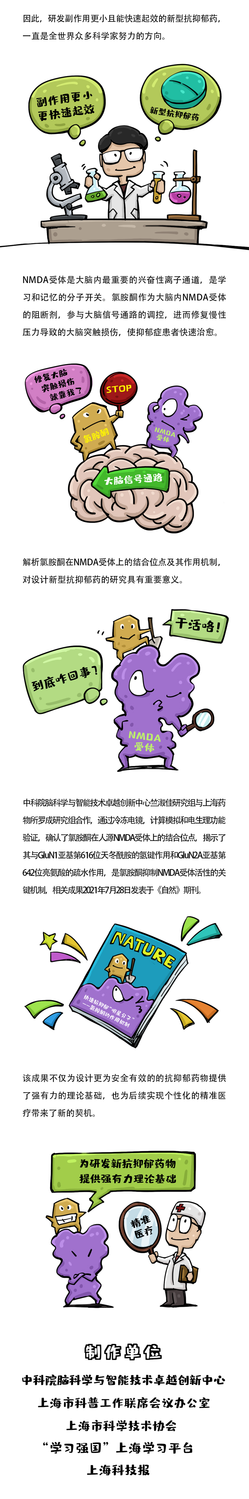 2021728日,《自然》期刊在線發表題為《氯胺酮作用于人源NMDA受體的結構基礎》的研究論文,該研究由中國科學院腦科學與智能技術卓越創新中心(神經科學研究所)、神經科學國家重點實驗室、上海腦科學與類腦研究中心竺淑佳研究組與中科院上海藥物研究所羅成研究組合作完成。該研究通過冷凍電鏡解析了NMDA受體結合快速抗抑郁藥氯胺酮的三維結構,確定了氯胺酮在NMDA受體上的結合位點,并進一步通過電生理功能實驗和分子動力學模擬,闡明了氯胺酮與NMDA受體結合的分子基礎。該研究為靶向NMDA受體設計新型抗抑郁藥的研發提供了重要基礎。