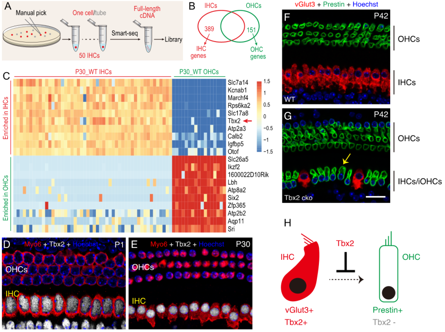 1. IHC缺失Tbx2后轉變為iOHC。(A-C) 單細胞轉錄組分析顯示轉錄因子Tbx2表達在IHC,但不表達在OHC。(D-ETbx2蛋白(白色)在新生(P1)和成年(P30)均表達在IHC,但不表達在OHC。(F-G) IHC在敲除Tbx2(黃色箭頭),vGlut3表達下調,同時Prestin表達上調。(HTbx2調控和維持IHC細胞命運的模式圖。