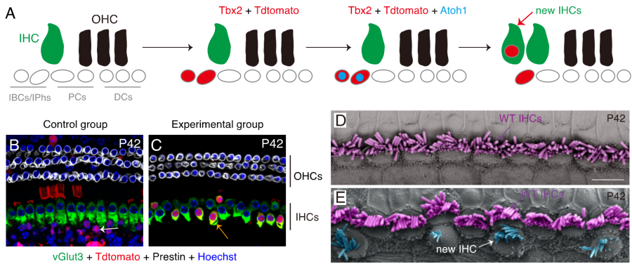 2 Tbx2Atoh1轉分化耳蝸支持細胞為vGlut3+IHC。(A)新生小鼠耳蝸支持細胞轉分化為IHCs的示意圖。(B)對照組小鼠耳蝸支持細胞(主要是IBCs/IPhs)只表達紅色熒光蛋白,但不表達內毛細胞功能蛋白vGlut3 (白色箭頭)。(C)實驗組小鼠耳蝸支持細胞同時表達紅色熒光蛋白、Tbx2Atoh1后轉變為vGlut3+ IHCs (黃色箭頭)。(D-E)掃描電鏡分析表明,與對照組相比(D),實驗組小鼠(E)具有額外一排不連續的IHCs,這些IHCs頂部有纖毛形成(白色箭頭)。