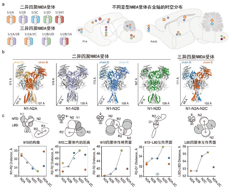 圖1.決定不同NMDA受體功能多樣性的分子基礎。a,不同NMDA亞型在不同發育階段的全腦分布(引自Paoletti et al., 2013)。b,c,不同NMDA受體亞型的三維結構及決定功能多樣性的結構基礎。