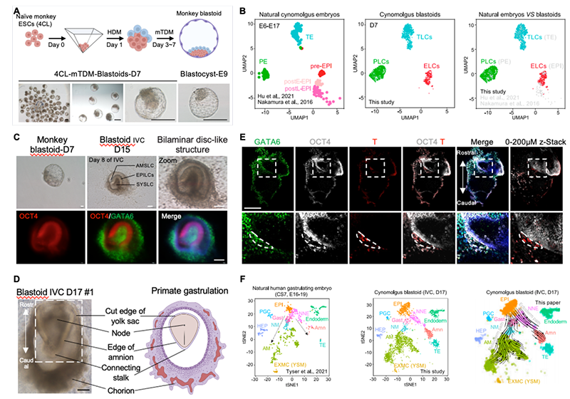 圖1.(A)非人靈長類食蟹猴類囊胚體外重構(gòu)。(B)scRNA-seq分析體外重構(gòu)的非人靈長類食蟹猴類囊胚的細(xì)胞譜系構(gòu)成。(C)非人靈長類食蟹猴類囊胚體外延遲培養(yǎng)至D15時形成的雙層胚盤樣結(jié)構(gòu)。(D)非人靈長類食蟹猴類囊胚體外延遲培養(yǎng)至D17時形成的原腸胚樣結(jié)構(gòu)。(E)非人靈長類食蟹猴D17類胚胎的形態(tài)學(xué)染色。OCT4, EPI marker. GATA6, amine marker. T(Brachyury), gastrulation marker. (F)非人靈長類食蟹猴D17類胚胎的單細(xì)胞轉(zhuǎn)錄組分析和發(fā)育路徑分析。