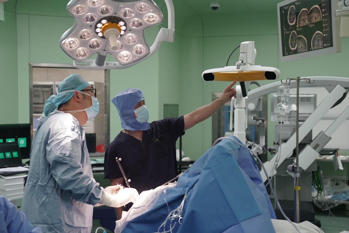 中國(guó)首例無線侵入式腦機(jī)接口系統(tǒng)前瞻性臨床試驗(yàn)手術(shù)現(xiàn)場(chǎng),華山醫(yī)院吳勁松教授與路俊鋒教授做討論